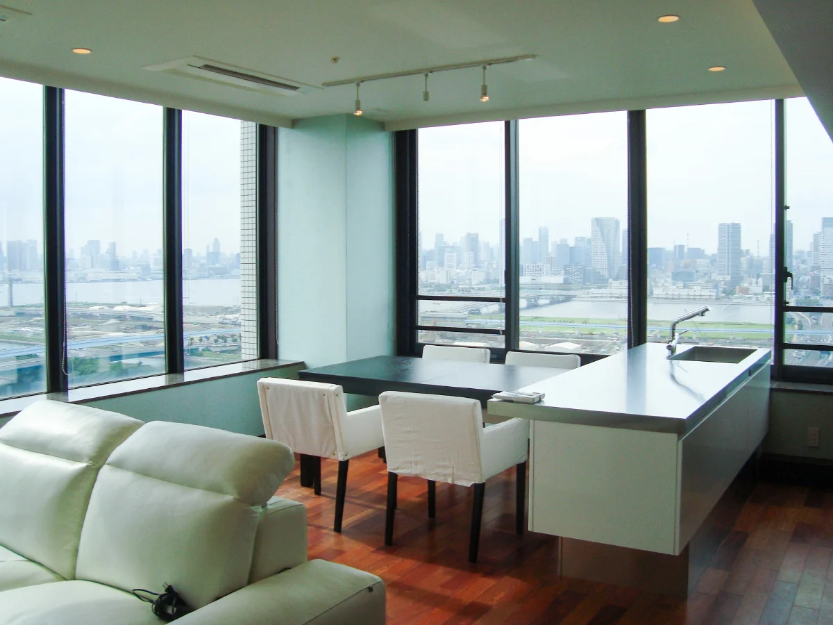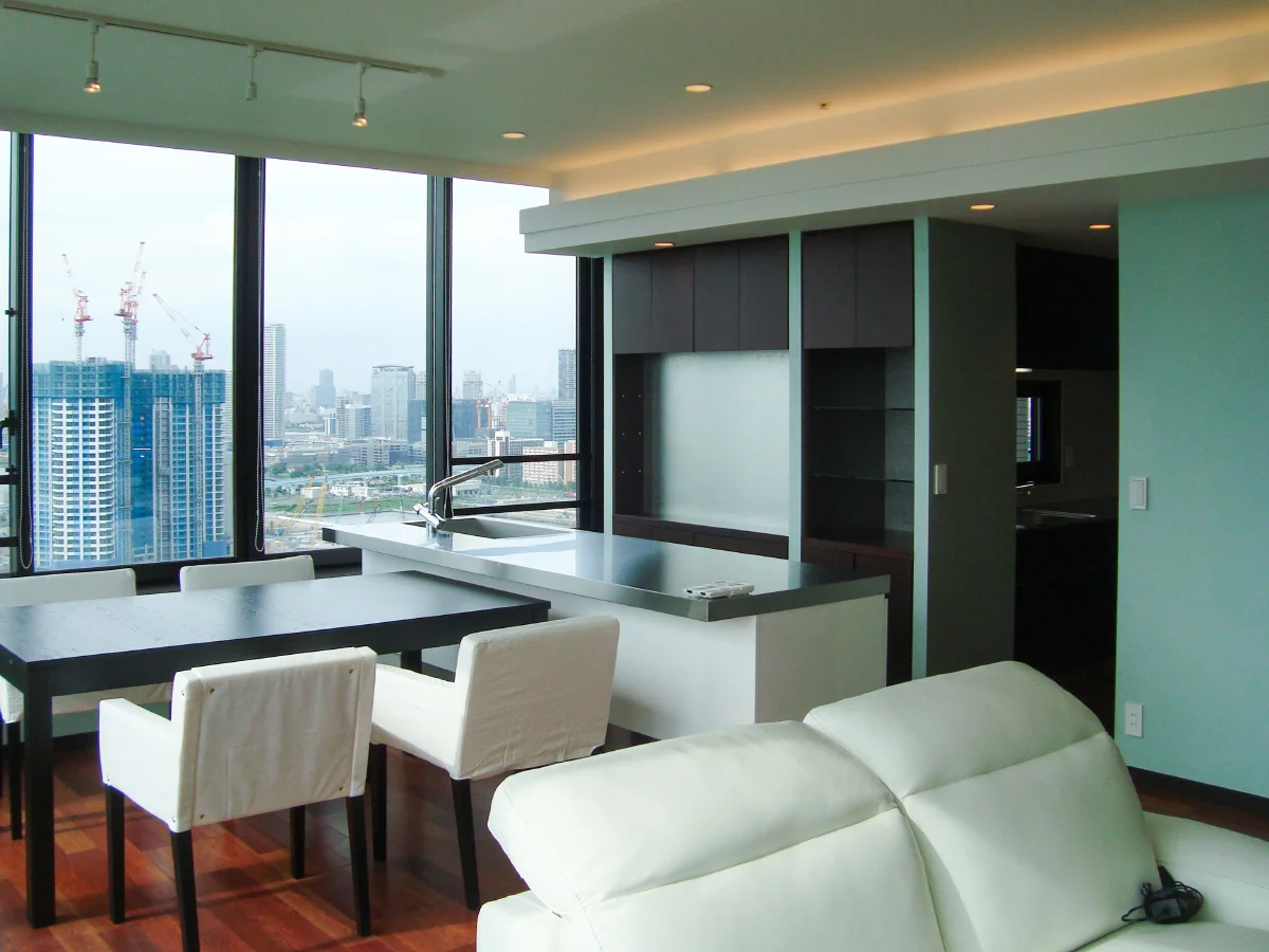 中古タワーマンションを購入したお客様からのリノベーションのご依頼。タイのホテルライクな室内をデザインし、来客用のおもてなしに、おしゃれなライブキッチンを設置しました。洗面化粧台は、ツーボウルにし、ご家族で使いやすくしました。