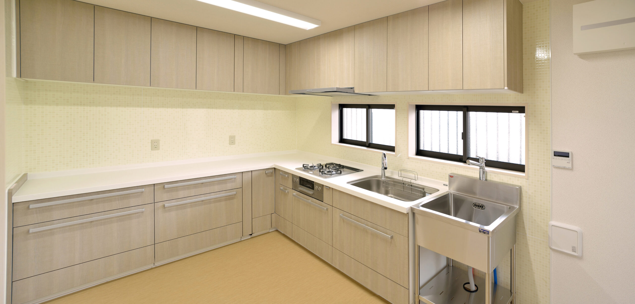 補助金を利用した介護施設のリフォーム工事(入札形式)を行いました。 築年数約50年の木造平屋の建物を外壁は増貼りを行い、内部に関しては、既存の壁・床を解体し必要な構造的な補強を行った後に、壁天井のクロス・床の塩ビシートを新調いたしました。