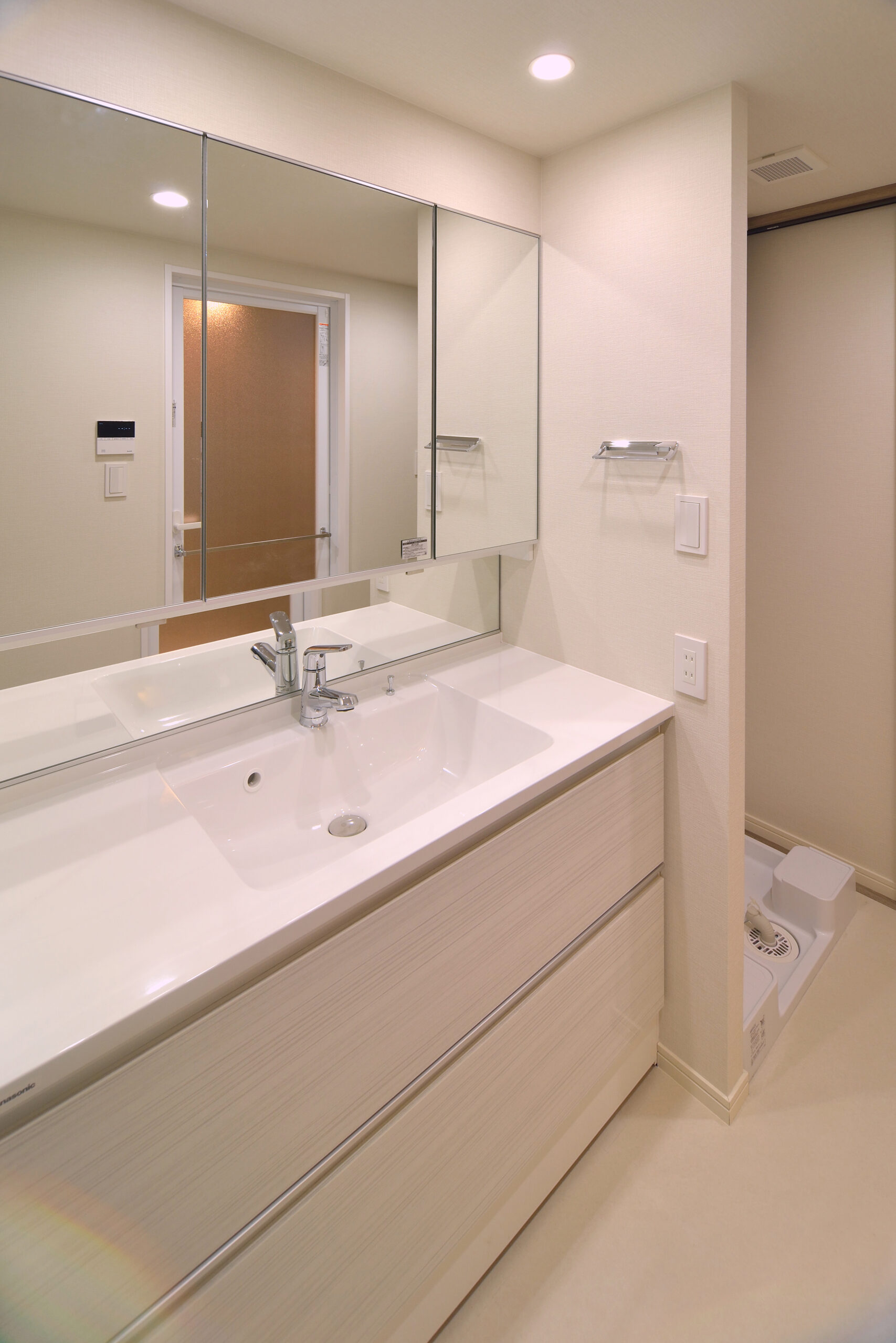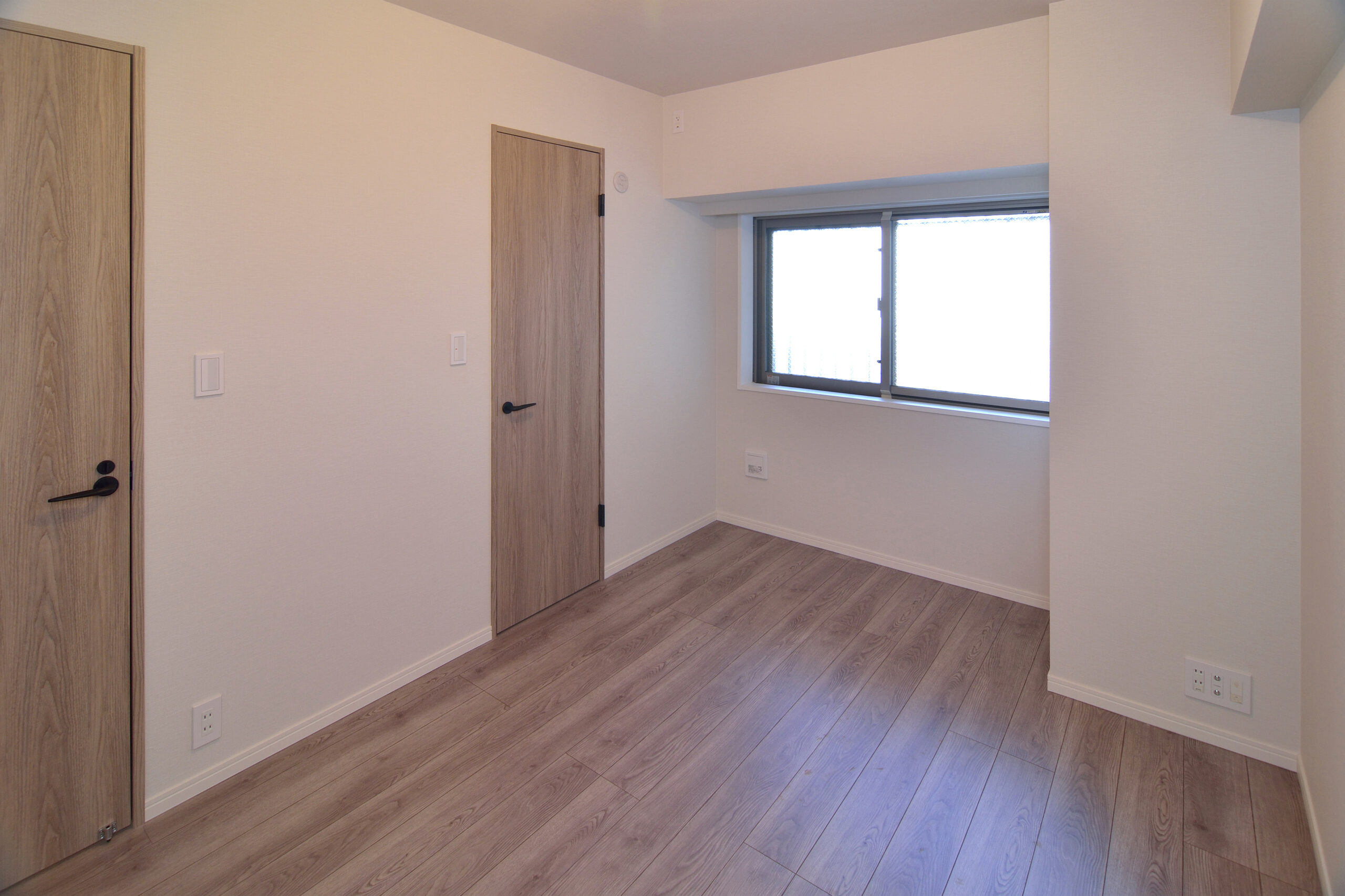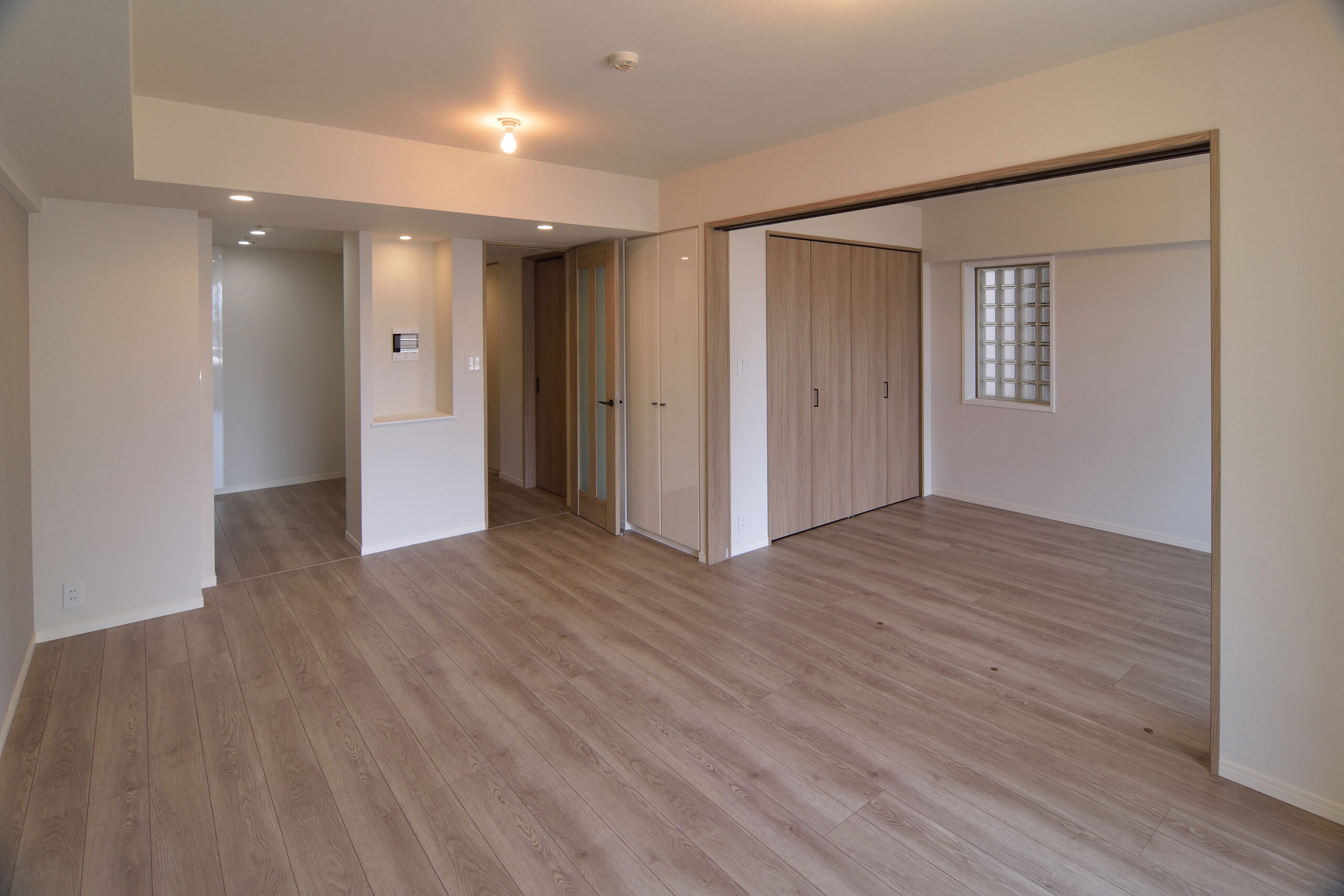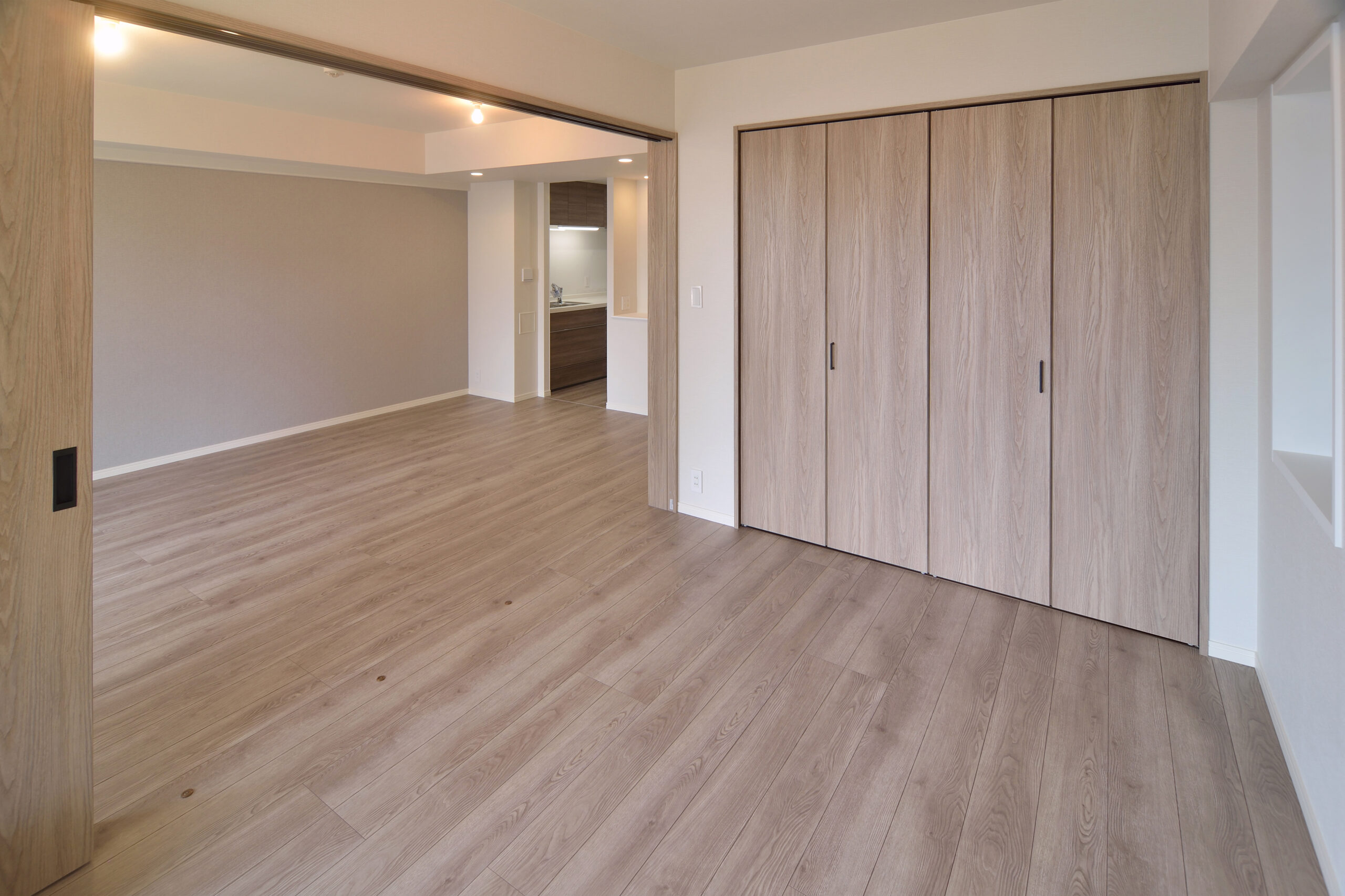 不動産会社様から販売用不動産のリフォーム工事のご依頼をいただきました。リビングと洋間に可動収納間仕切りを設置することにより、使い勝手に合わせ自由自在にリビングの大きさが調整する事のできるようにリノベーションしました。カラースキームは全体的にやわらかさと温もりをあわせもつグレージュベースのモダンテイストで統一しました。