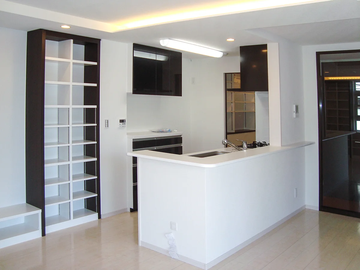 ご親族の土地を利用して、ご夫婦が二世帯住宅の新築をご計画。 施主様のご要望を提携設計士と当社現場監督とで実現。 リビングに書籍棚を造作、たくさんの書籍を収納することができました。 リビングと廊下にガラスのパーテーションを設けることにより、人の動きが分かる造りに。 2階ルーフバルコニーは、デッキ敷き(お庭風)にしました。