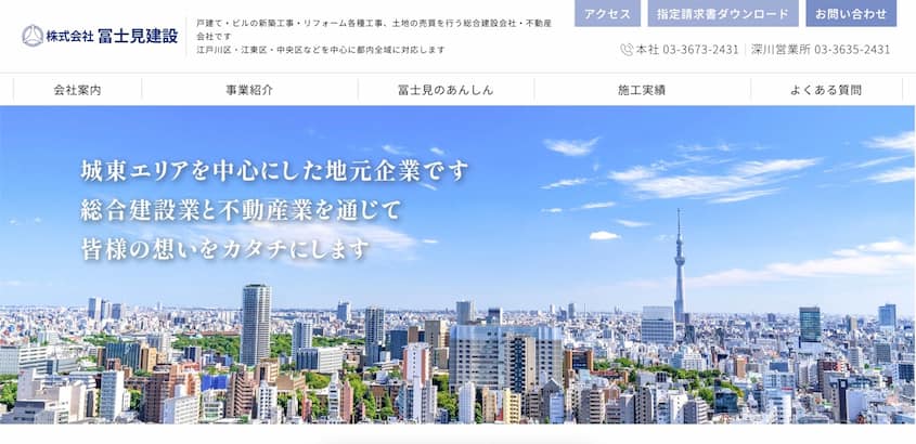 株式会社 冨士見建設は、中央区に隣接した江東区に深川営業所を構えているため、どのエリアに対しても、概ね30分以内には到着できます。